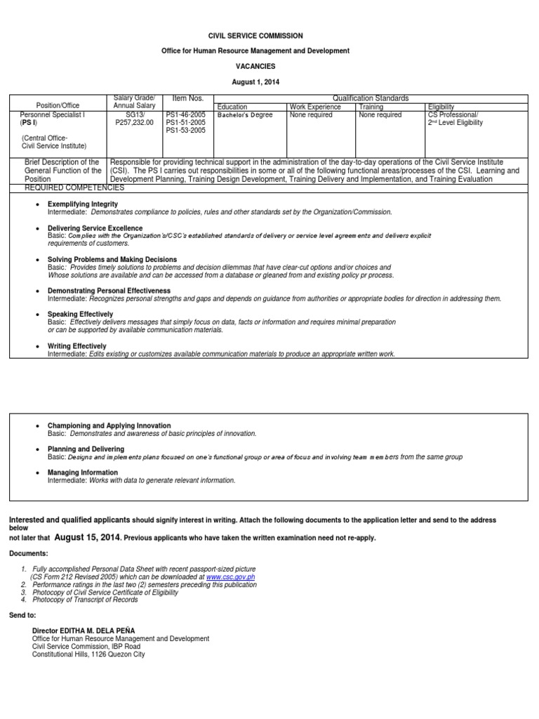 Bulletin Of Vacant Positions Civil Service Commission Davao