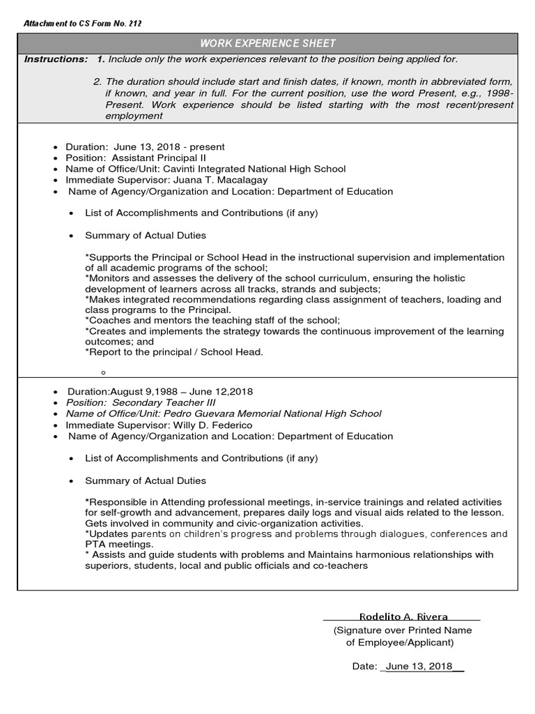 Cs Form No 212 Attachment Work Experience Sheet 1 Rodel