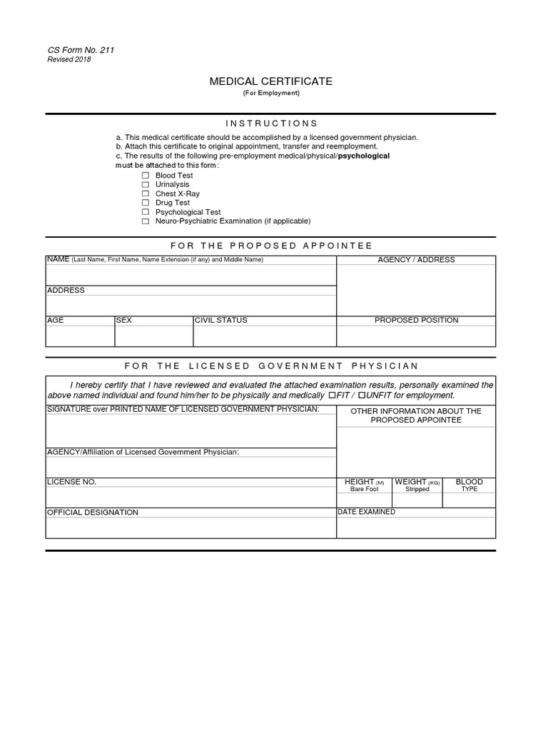 Csc Form 211 Medical Certificate Pdf Health Sciences