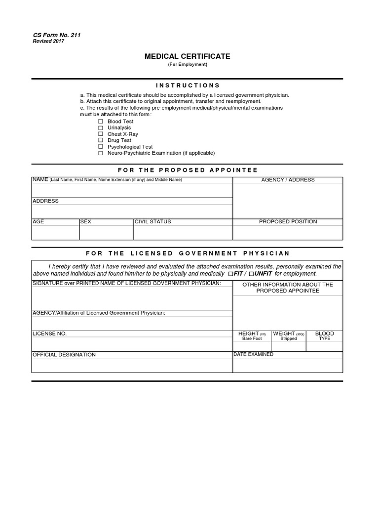Cs Form No 211 Medical Certificate Physician Health Sciences