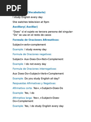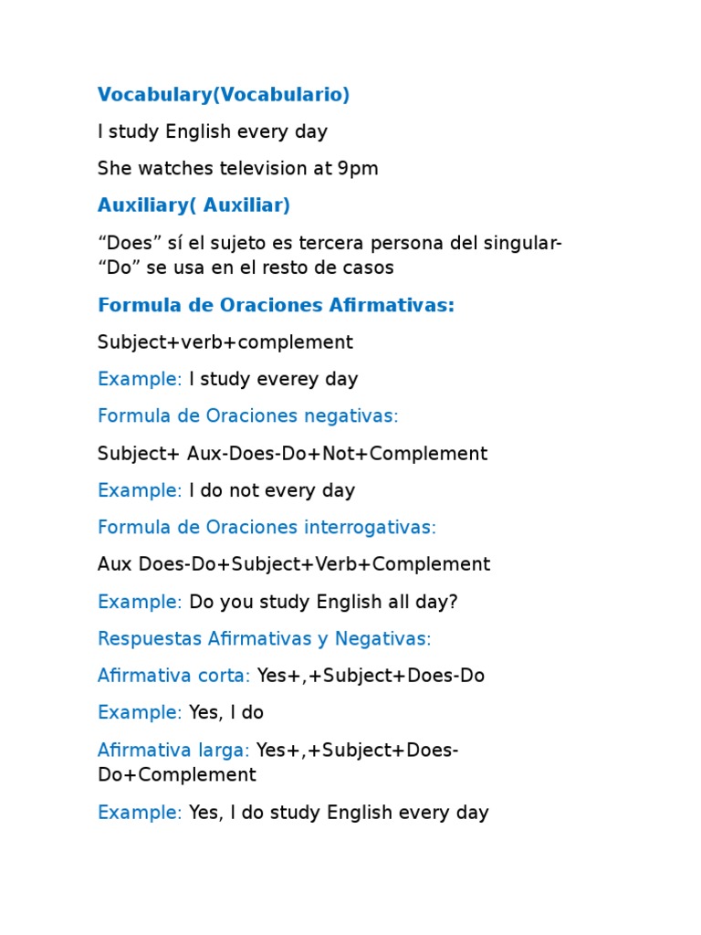 Vocabulary Vocabulario Example Formula De Oraciones Negativas